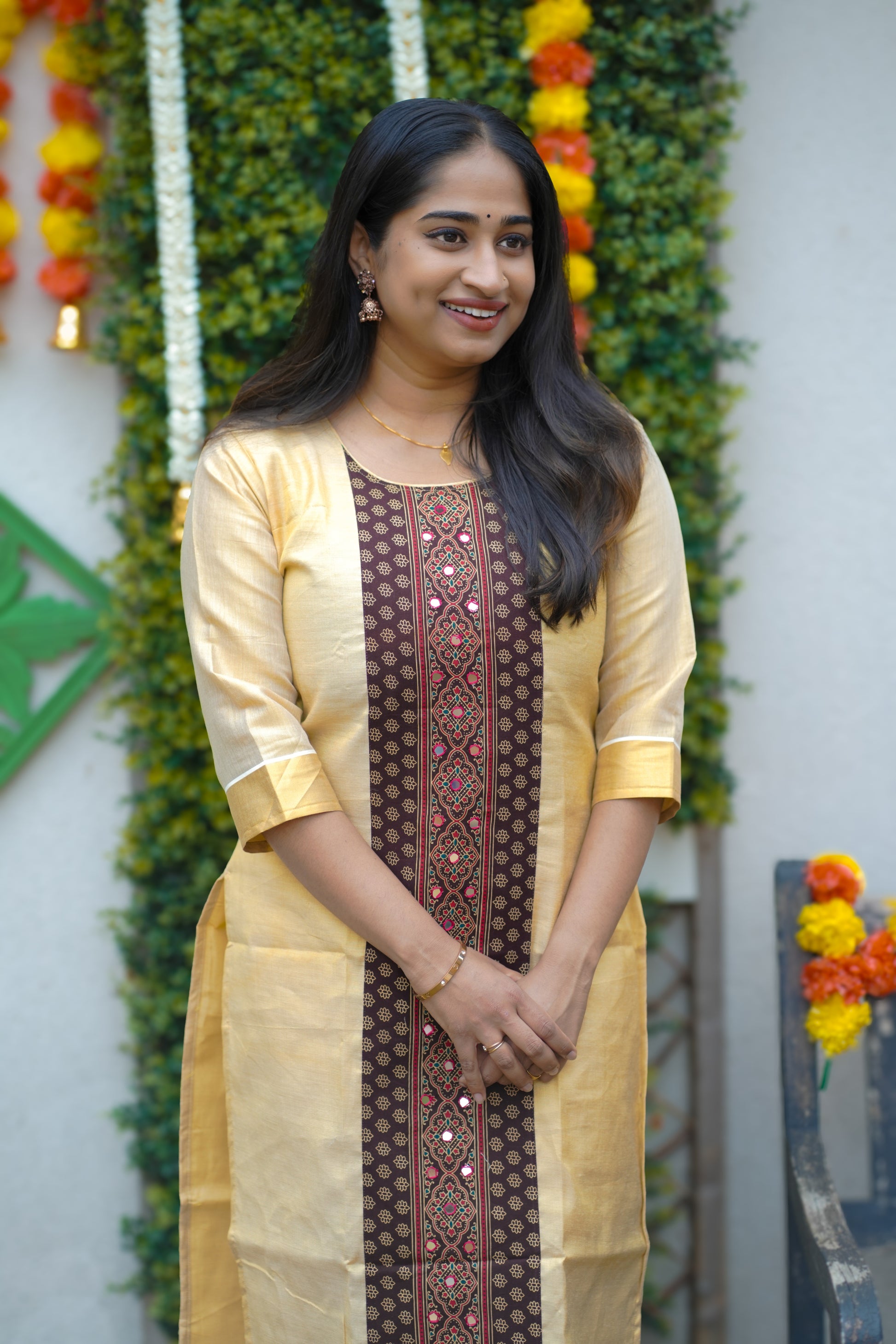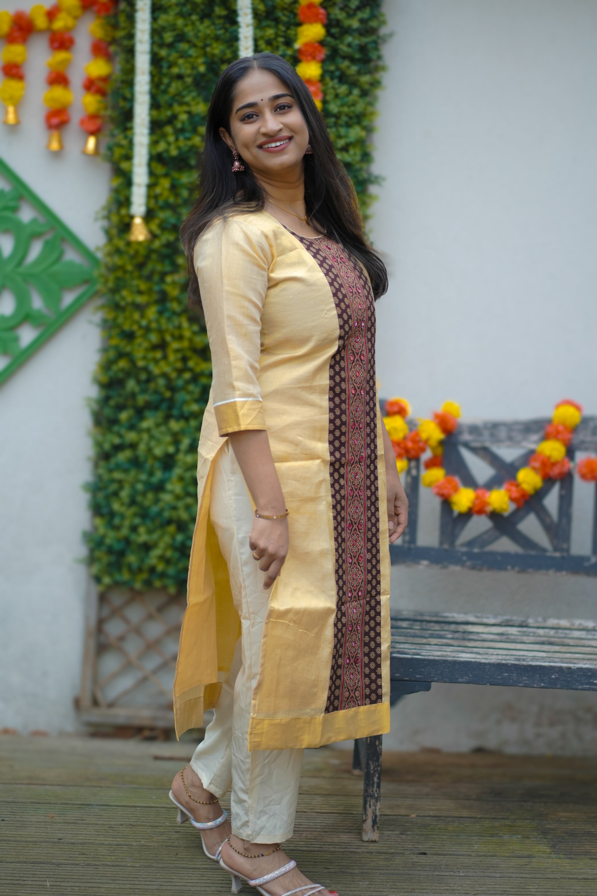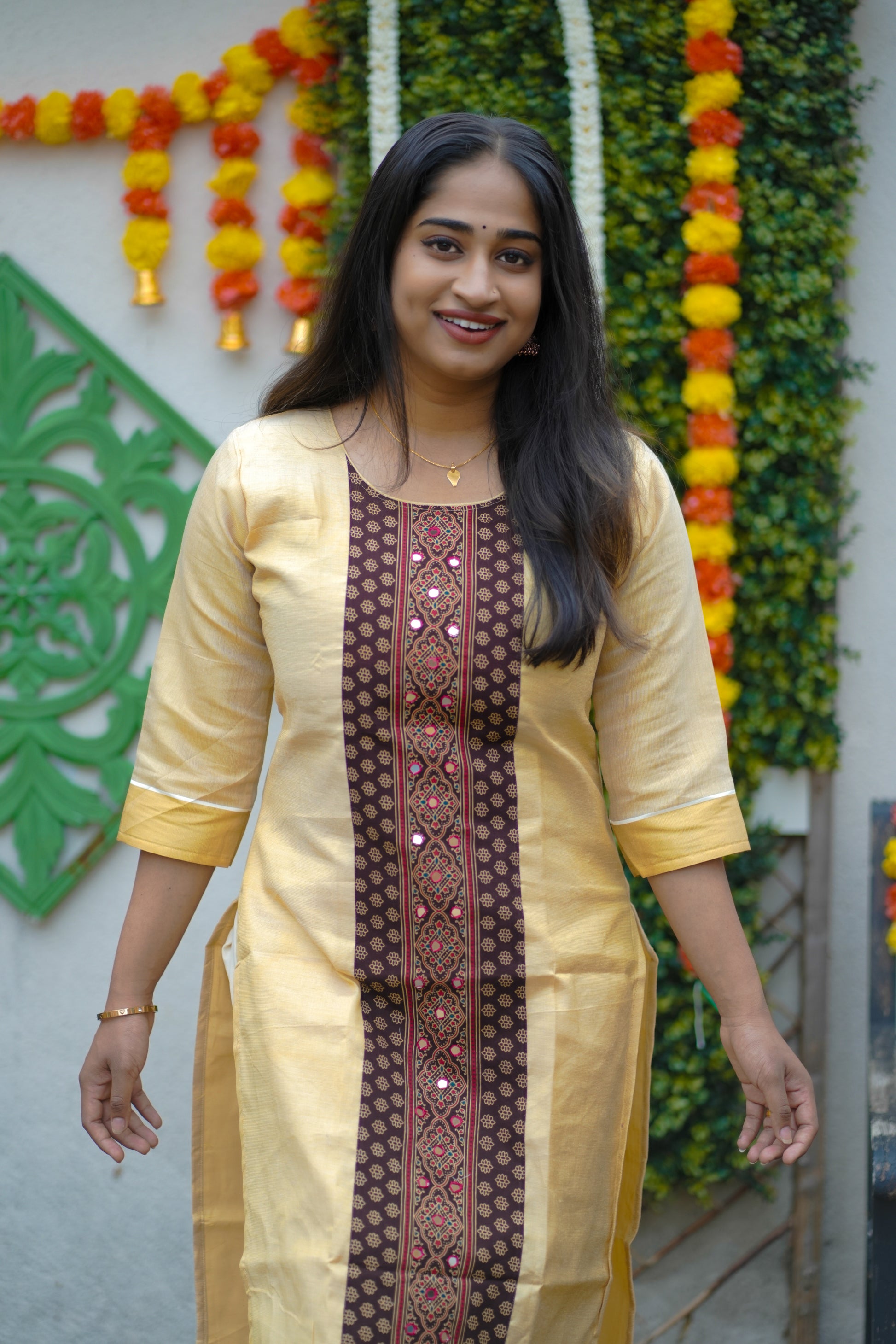 Experience the elegance and beauty of traditional Onam celebrations with our kurti. Made from high-quality tissue kasavu fabric, this top features intricate designs that will surely make you stand out. Perfect for any festive occasion, indulge in the rich cultural heritage with our Onam special kurti top.