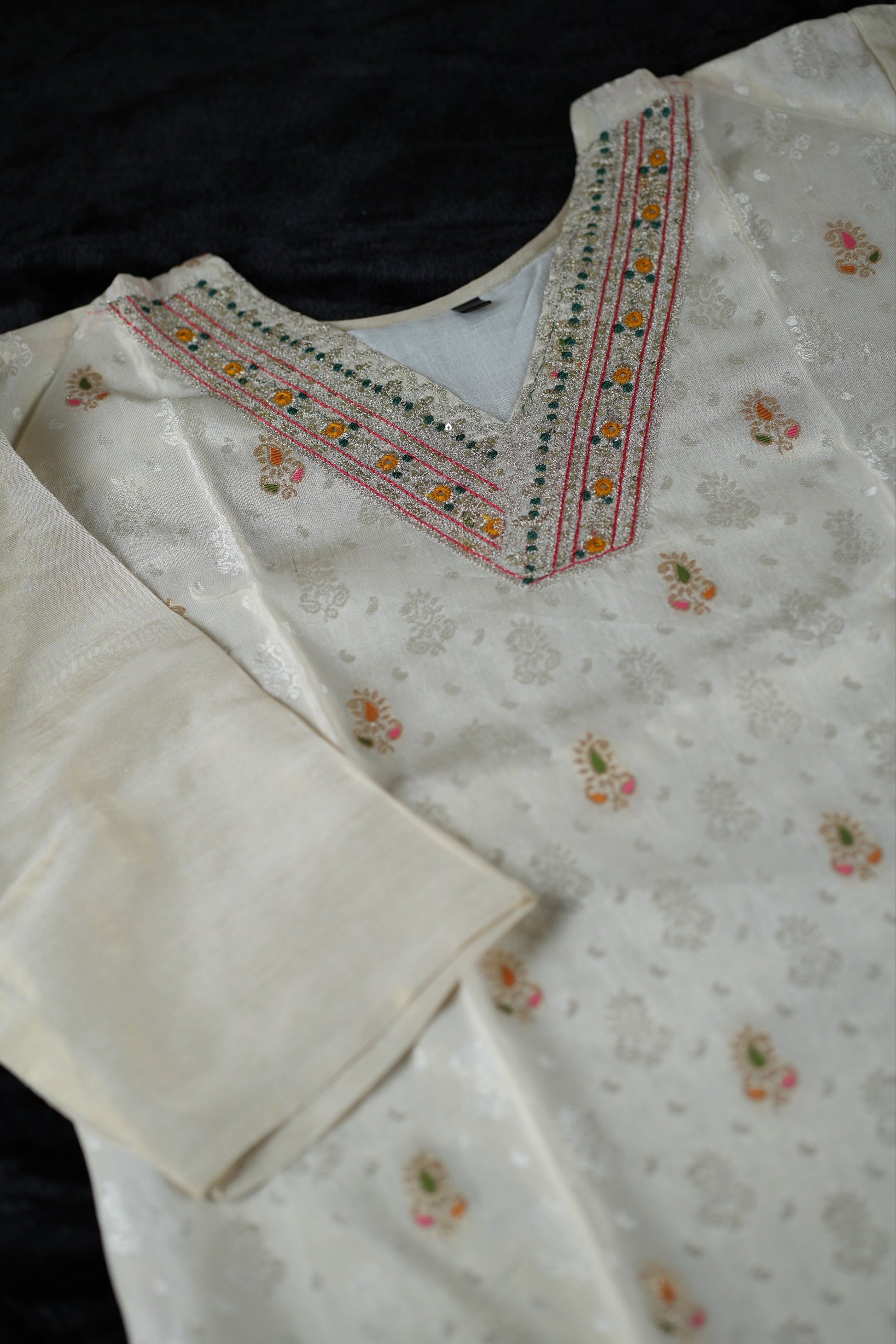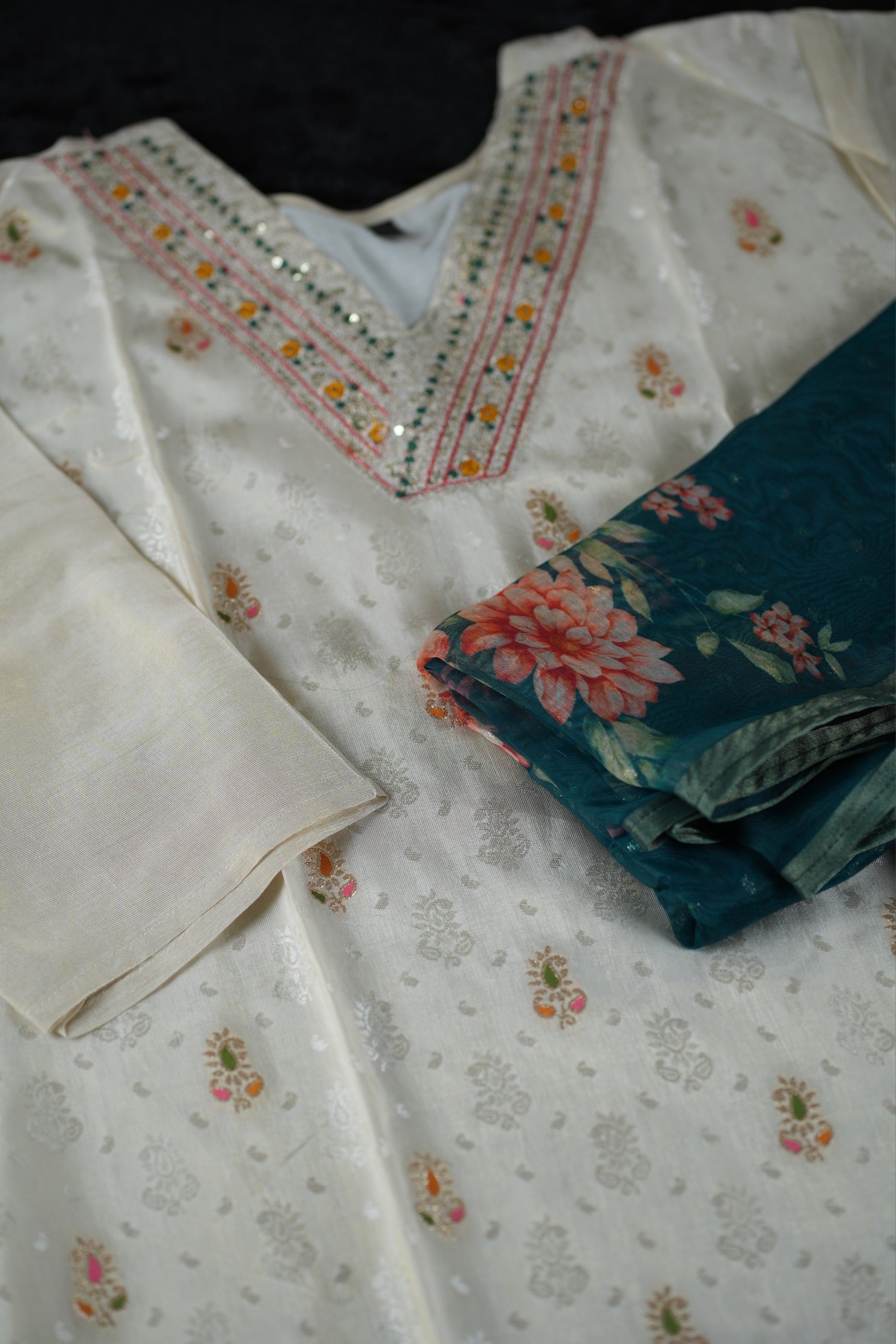 This elegant Kurti set in off white features delicate embroidery and a soft inner lining. The accompanying green dupatta with floral print adds a touch of color and style, making this a versatile and sophisticated addition to your wardrobe. Perfect for any occasion, this Kurti set is a must-have for any fashion-forward individual.