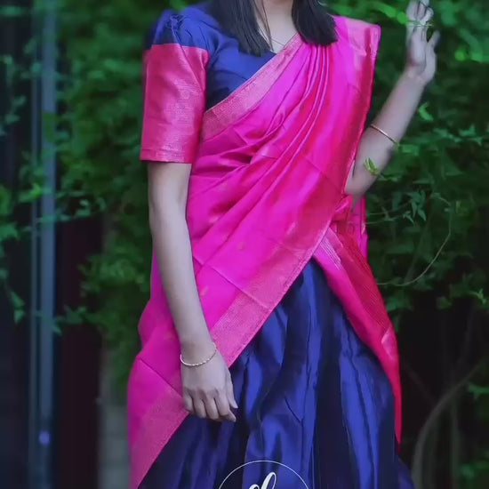 This luxurious Silk Dhavani set is crafted from high-quality tissue silk material that exudes elegance. The set comes with a beautiful blouse and skirt, making it a versatile and stunning addition to any wardrobe. With its soft texture and graceful design, this set is perfect for any formal occasion or event. Elevate your style with this timeless piece.