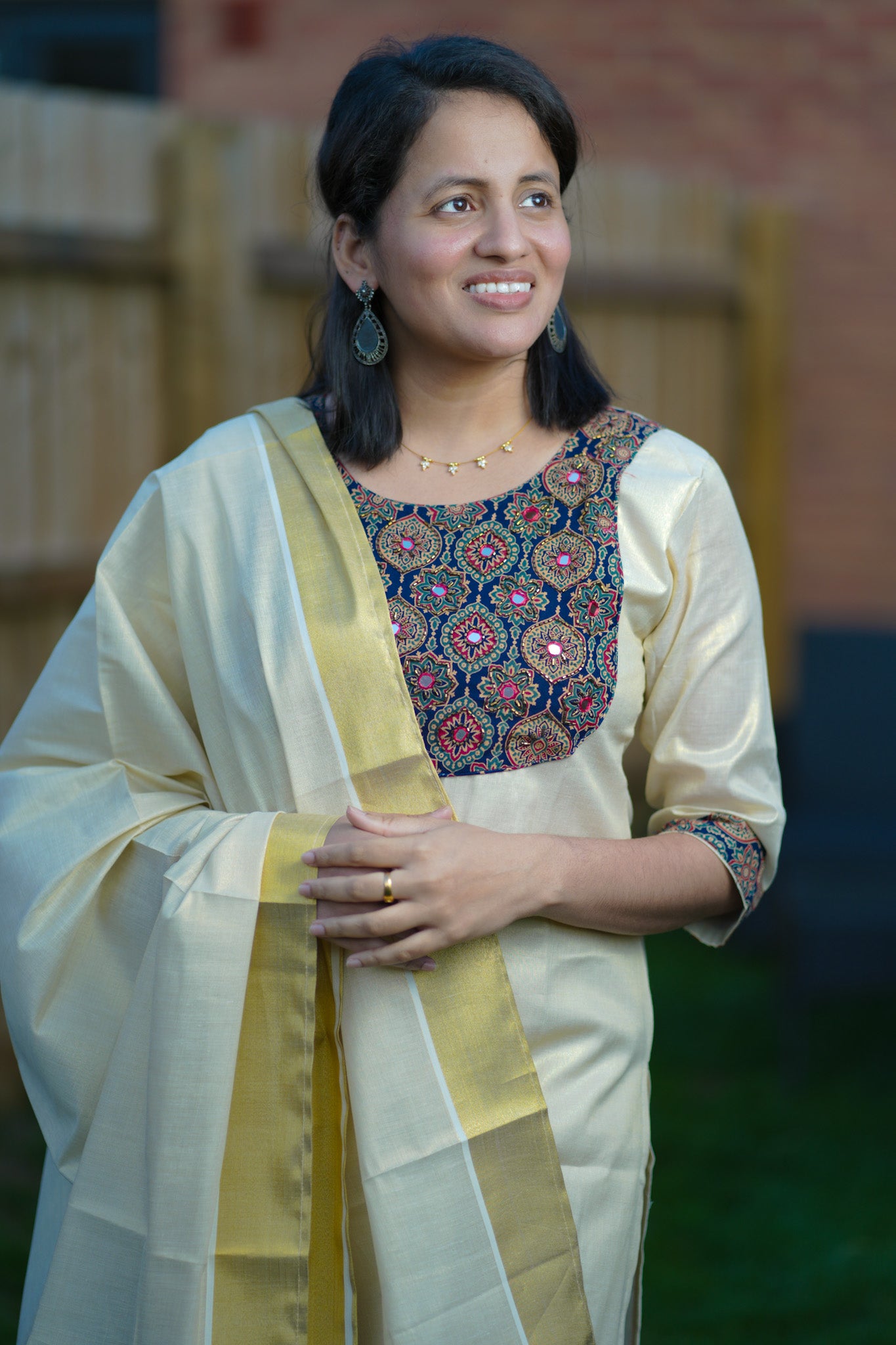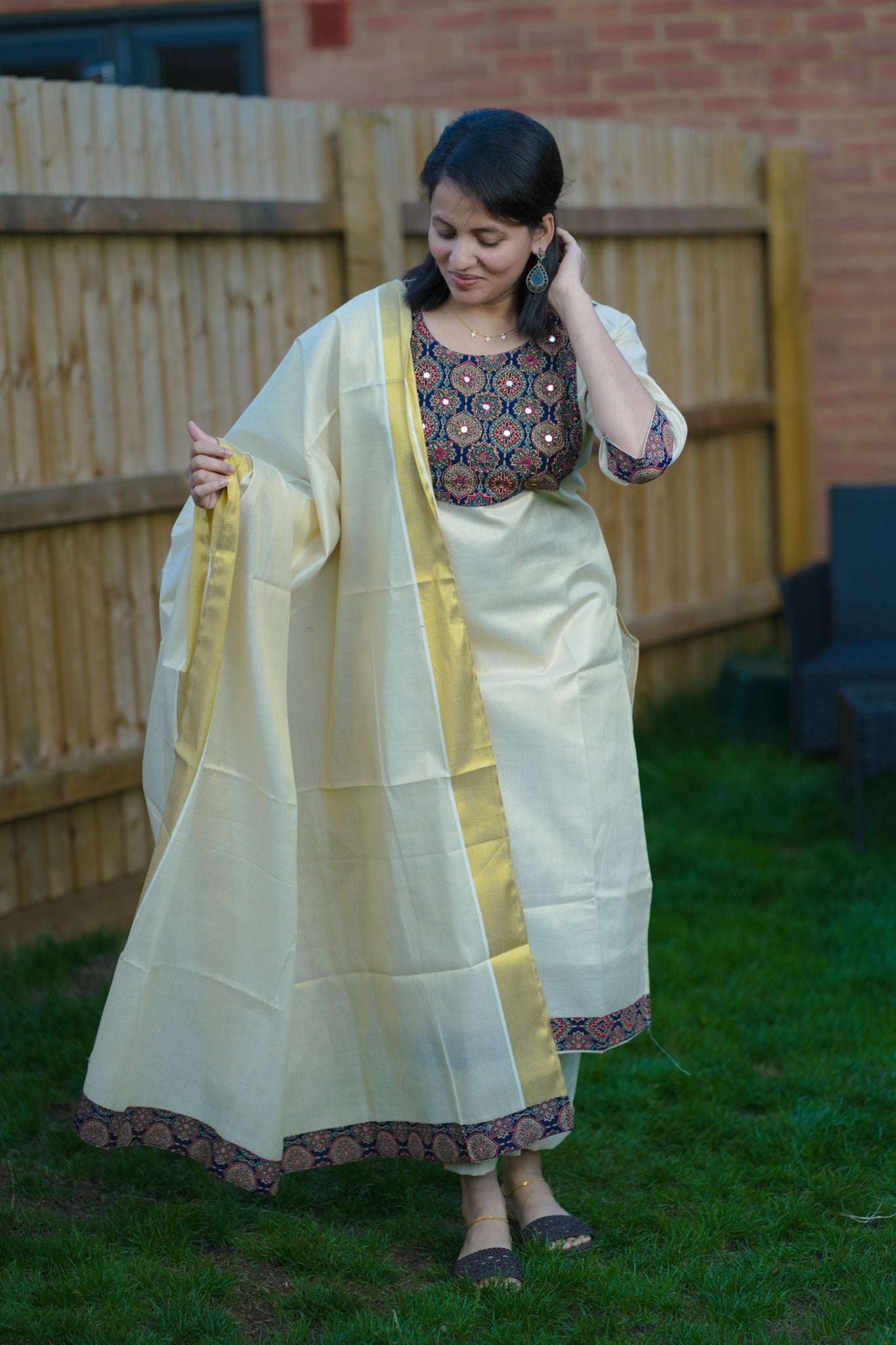 Tissue Kasavu Kurti set in Ajrakh design (KER-1162)