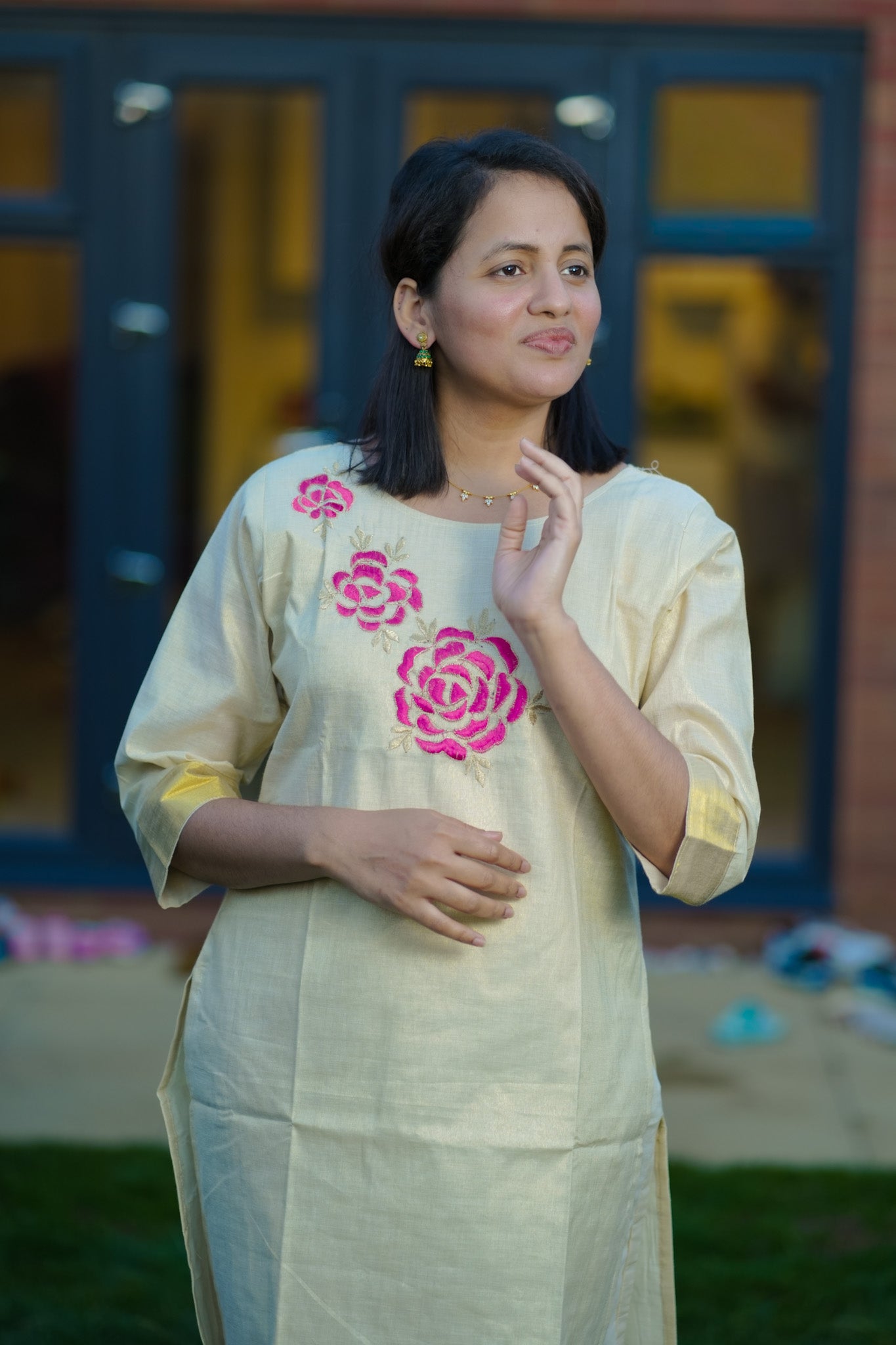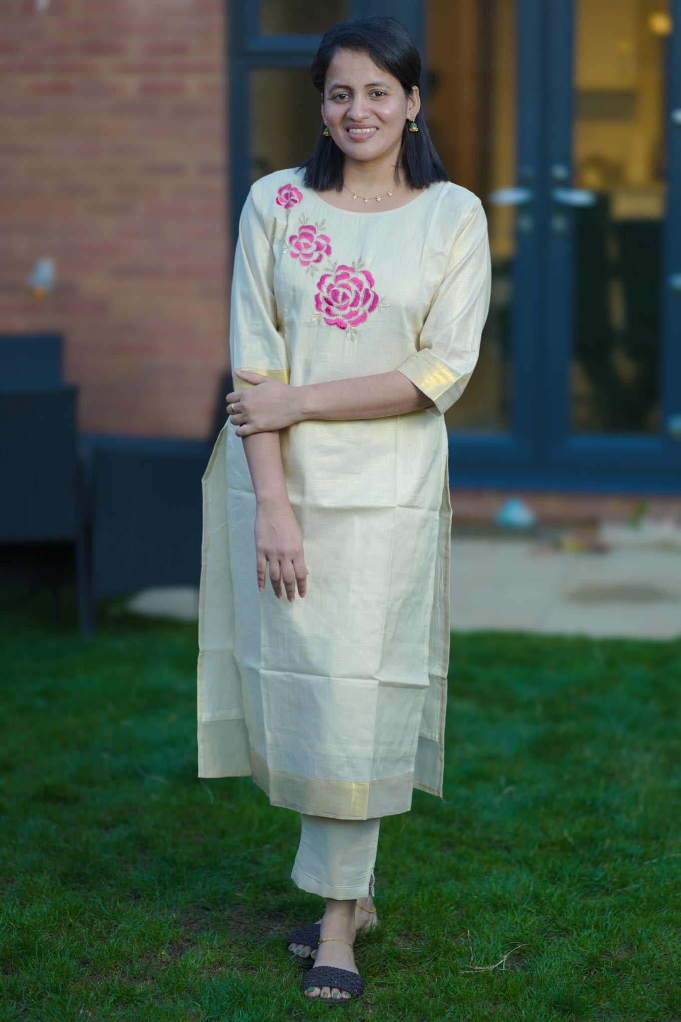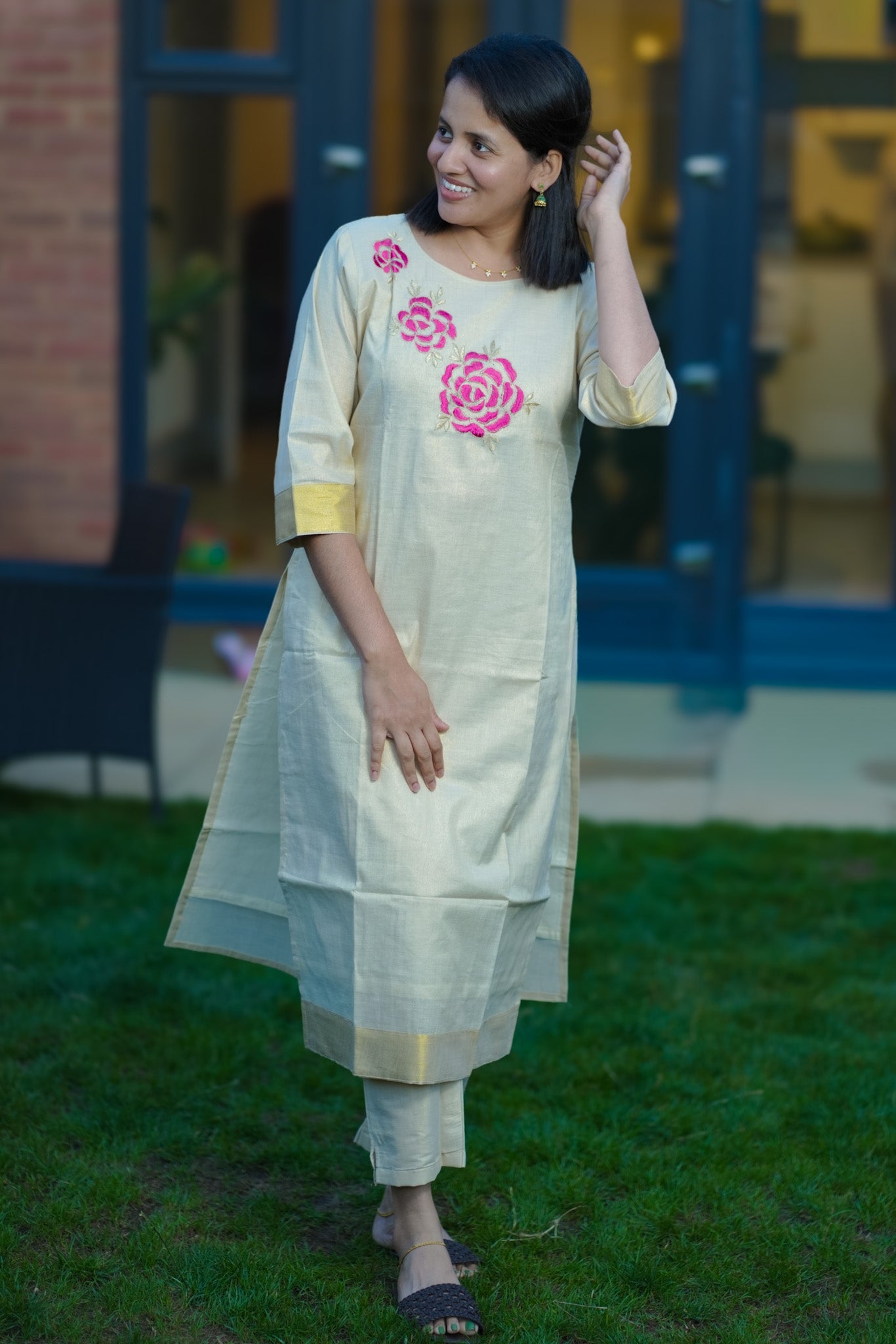 Experience the elegance and beauty of traditional Onam celebrations with our kurti. Made from high-quality tissue kasavu fabric, this top features intricate designs that will surely make you stand out. Perfect for any festive occasion, indulge in the rich cultural heritage with our Onam special kurti top.